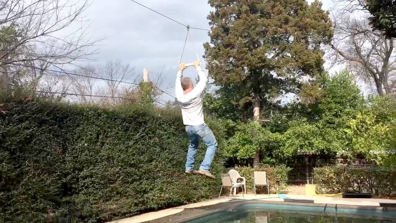 A senior man zip lines over a backyard pool, but the line breaks, and he falls in the water.