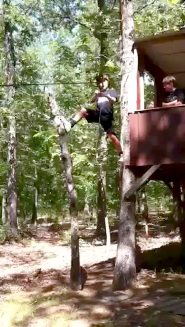 A young man hangs on a zip line outdoors as he tries to knock over a broken tree. When the top half of the tree falls, the man falls. Short tails.