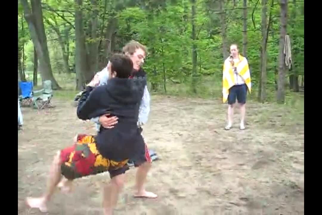 Two teen boys practice swing dancing moves in the woods at a camp ground while teen boys and teen girls watch. One of the teen boys throws the other up into the air. He falls down to the ground, hard.