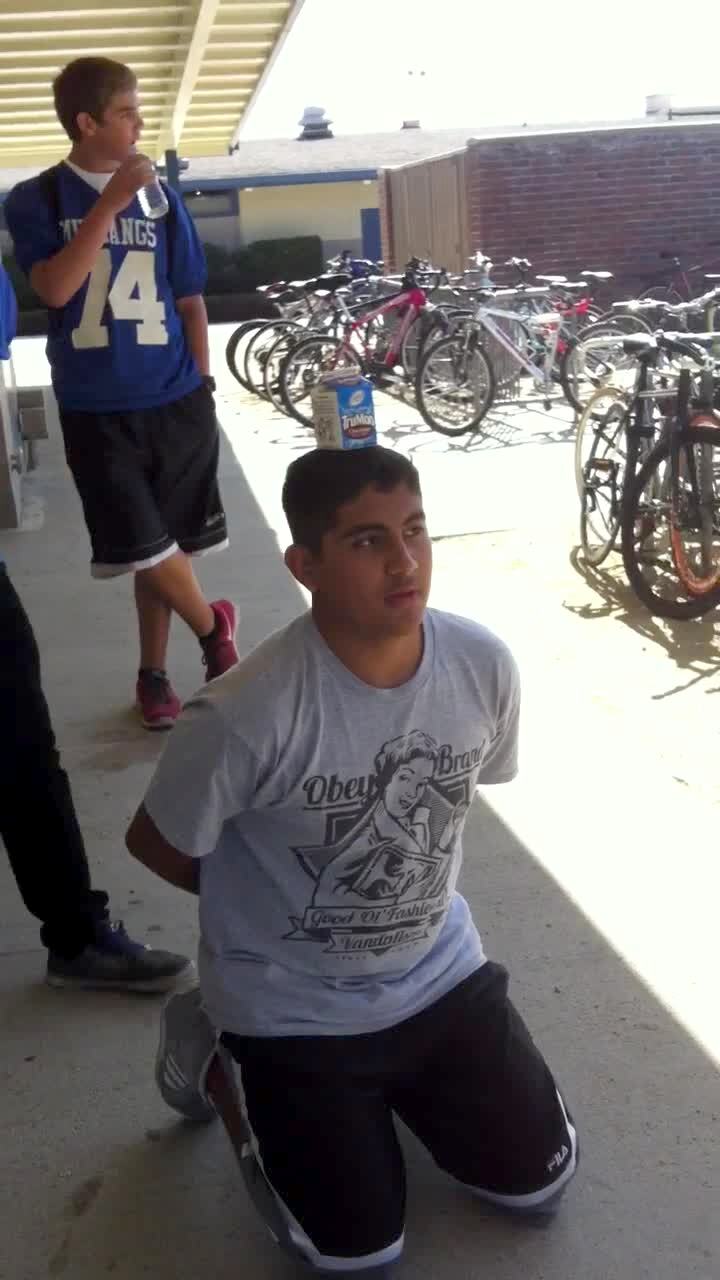 A teen boy kicks a can off of another teen boy's head outdoors. The can flies away and hits a third boy in the groin.