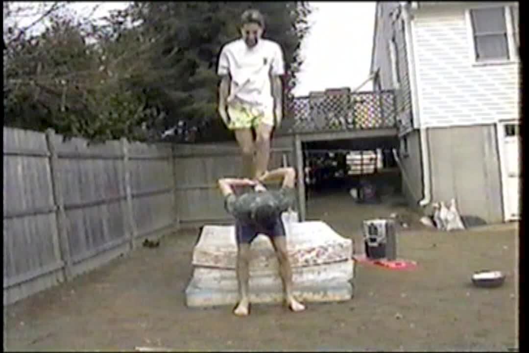 Teen boy does a flip off of 2nd teen boy's back and falls to the ground when he tries to land on a mattress.