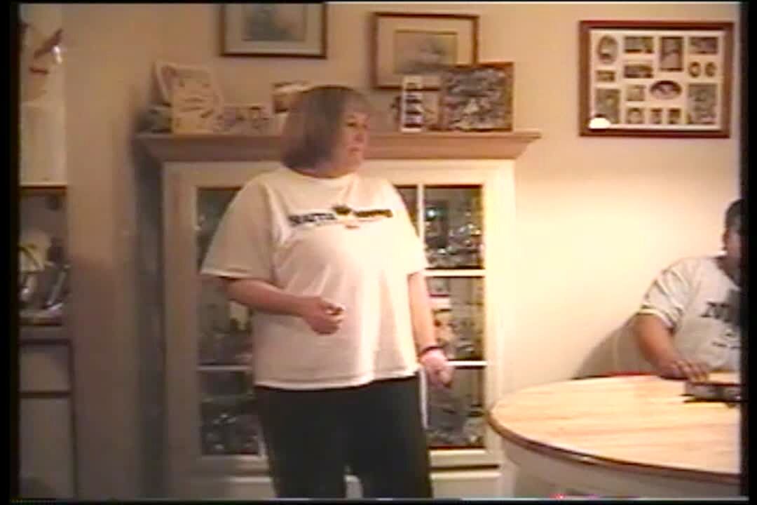 A woman puts her tongue on a bug-zapper racket for a "half a tank of gas." It shocks her and she jumps back. Her family laughs in the kitchen.