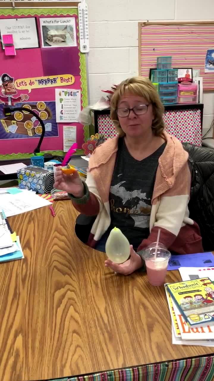A woman pops a balloon in a classroom with the rind of an orange. She screams when the balloon pops and laughs.