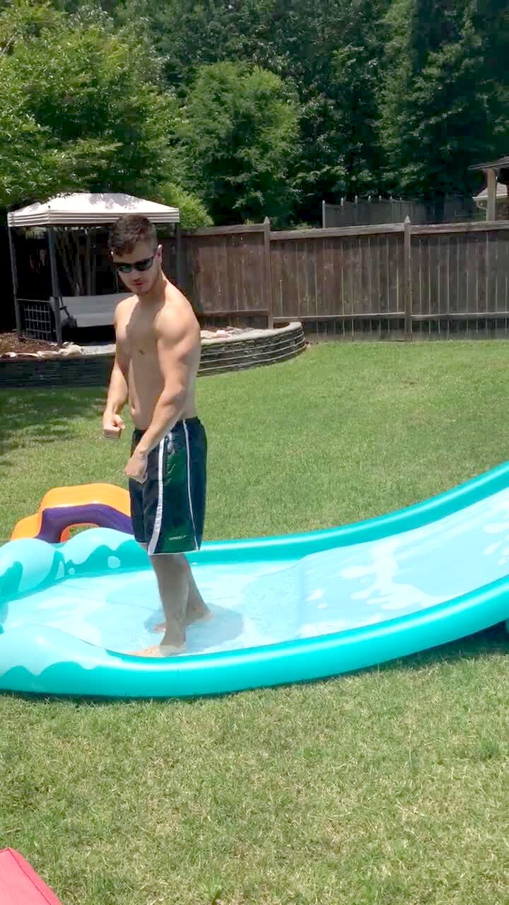 Tot girl in Barbie car reverses, runs over dad's foot in hallway, then backs up into him laying on floor. Dad plays it up.