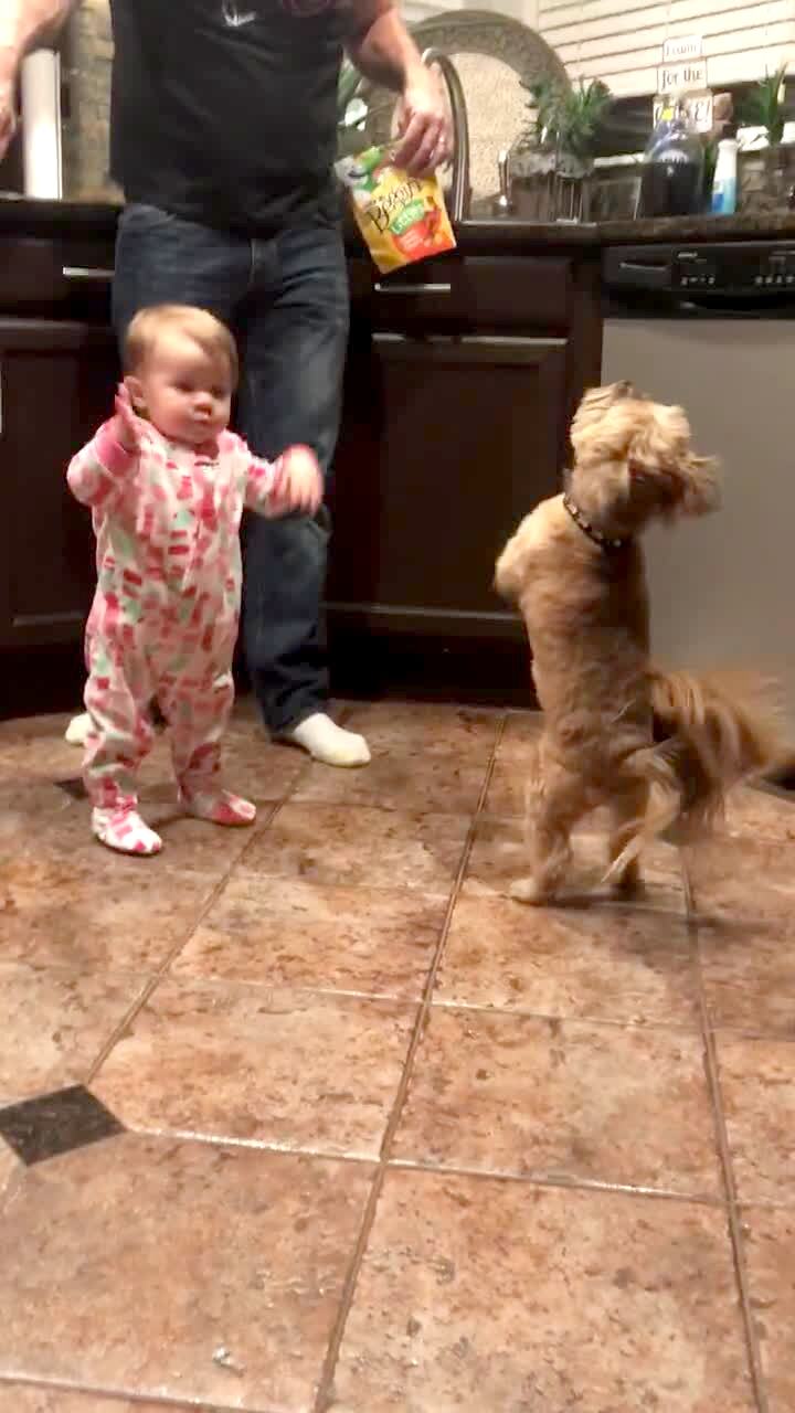 A dog stand on its hind legs and begs for food and a tot girl waves her arms in the air and copies him.
