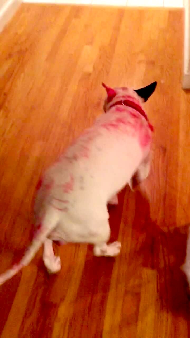 A tot girl drew all over her dog with a red marker. Her dad films and asks her what she did.