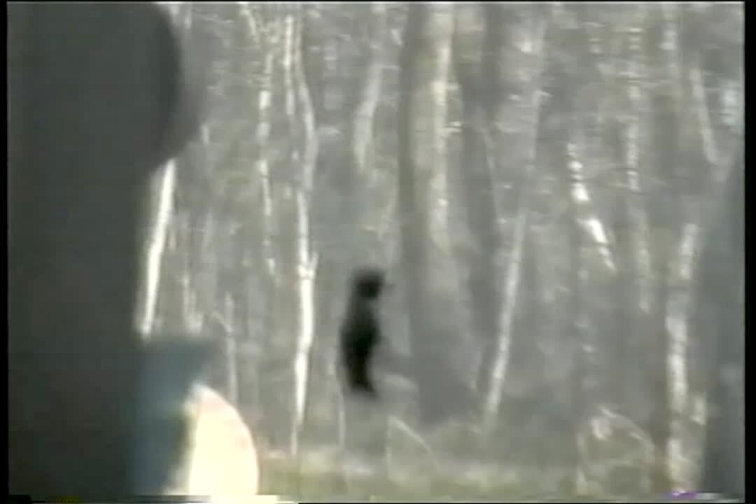 A man arrives home and carries food to the front door of his house, but he stops when a bird flies in a circle around the door. He asks the bird to move, but it flies towards him. He screams and runs away. Security footage.