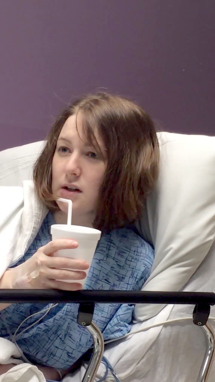 A woman lies in a hospital bed indoors and tries to stick a straw into her mouth, but she keeps missing. A men off camera asks her basic questions, and the woman answers slowly. She doesn't know the date, and she doesn't remember having a colonoscopy. She complains "my mouth doesn't work!" She burps three times in a row and says she doesn't know where she is.
