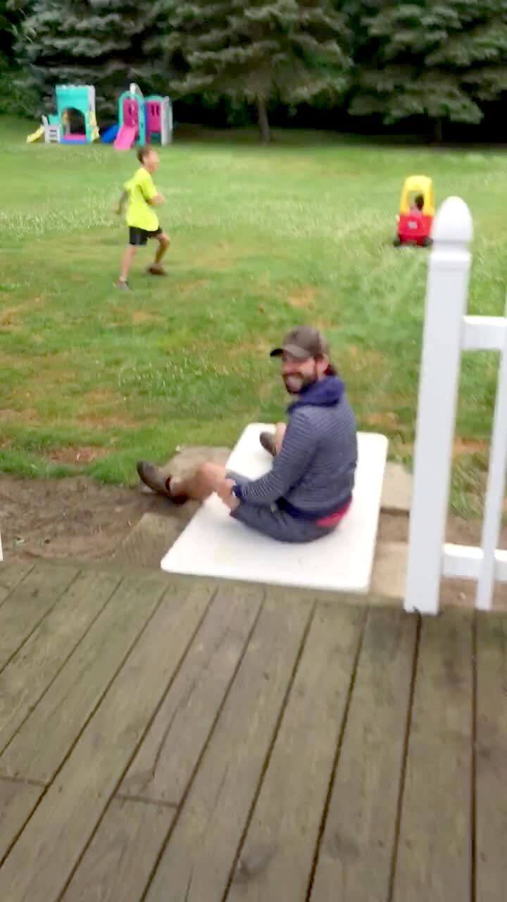 A man holds a baby over the grass in the backyard and the baby hovers over it.