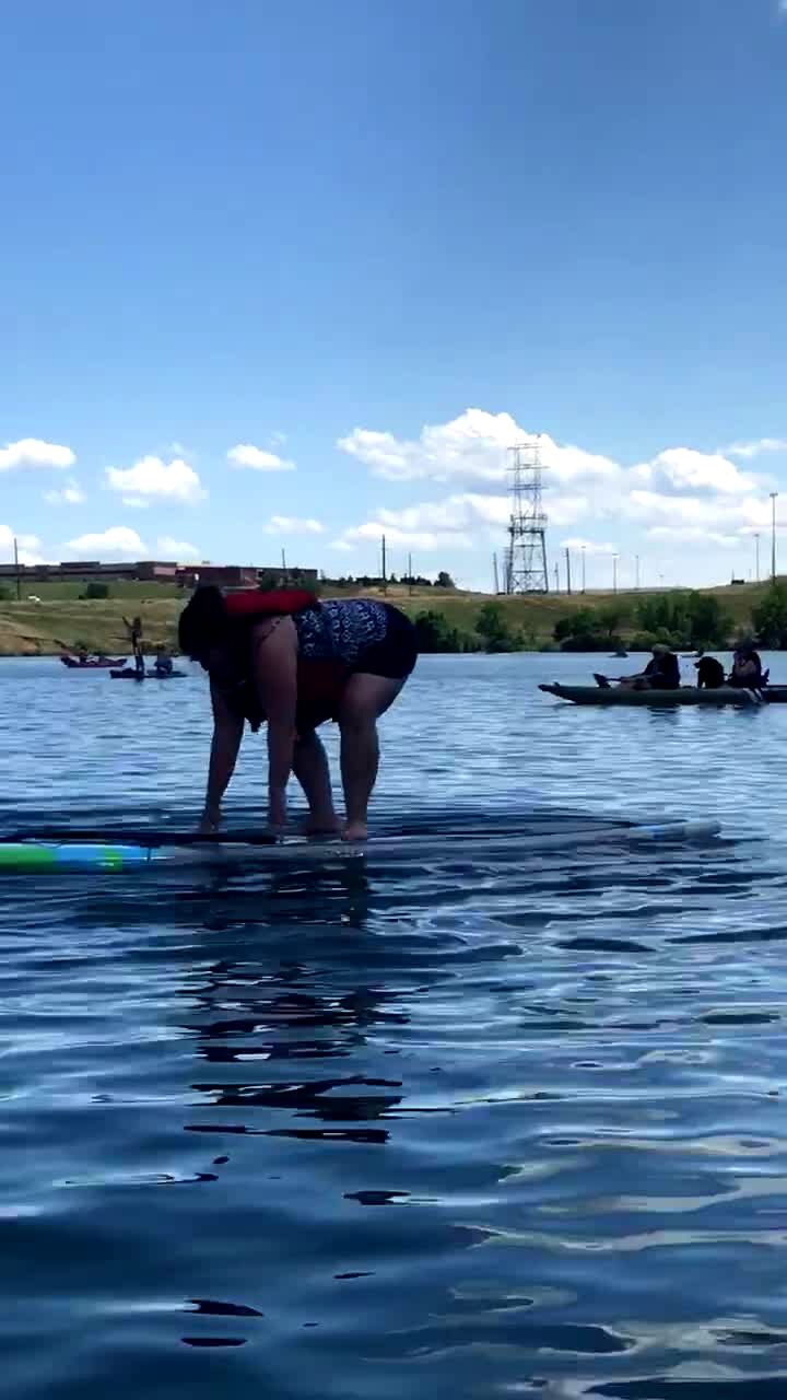 Teen girl tries to scare a snake away on the pier with a tree branch. The snake climbs through the wood planks at the girl's feet and scares her.