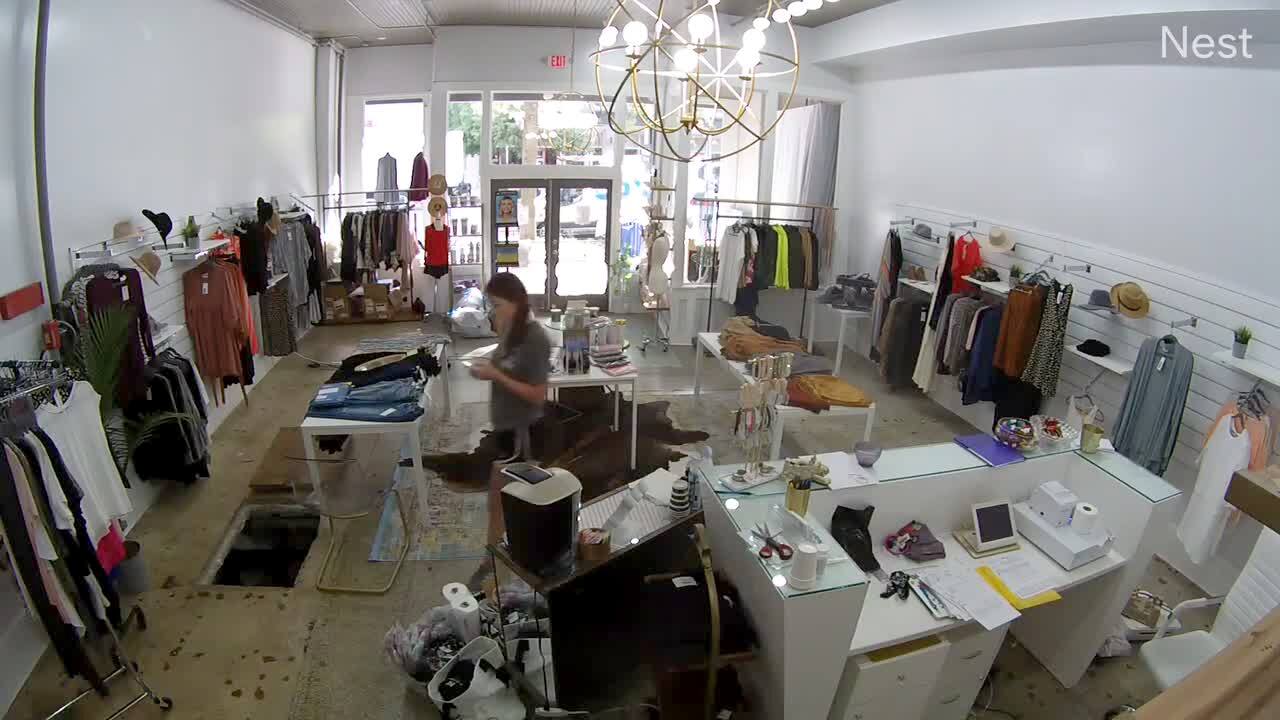 A woman waters a plant on the front porch and screams when a bird flies out of a planter.