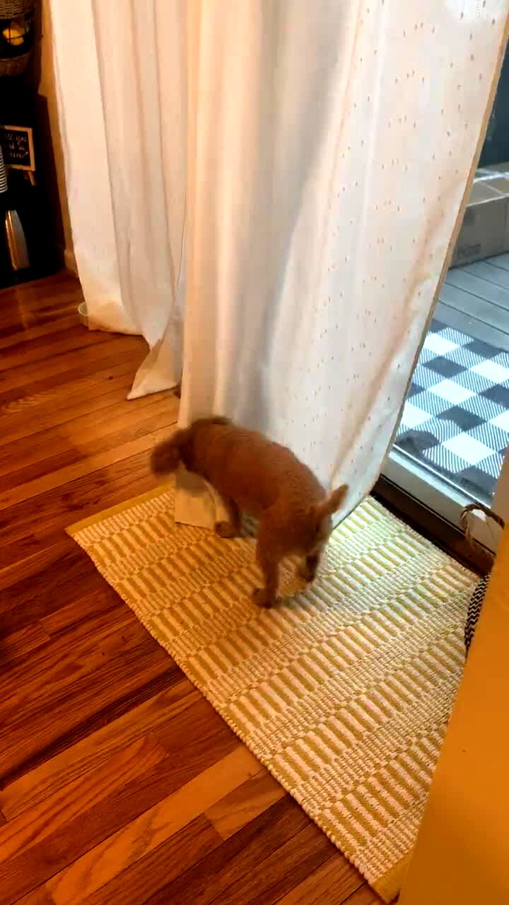 A young girl swings a bag of cat litter around as she takes it out to the trash, but the bag breaks and the litter hits the side of the house. Security footage.