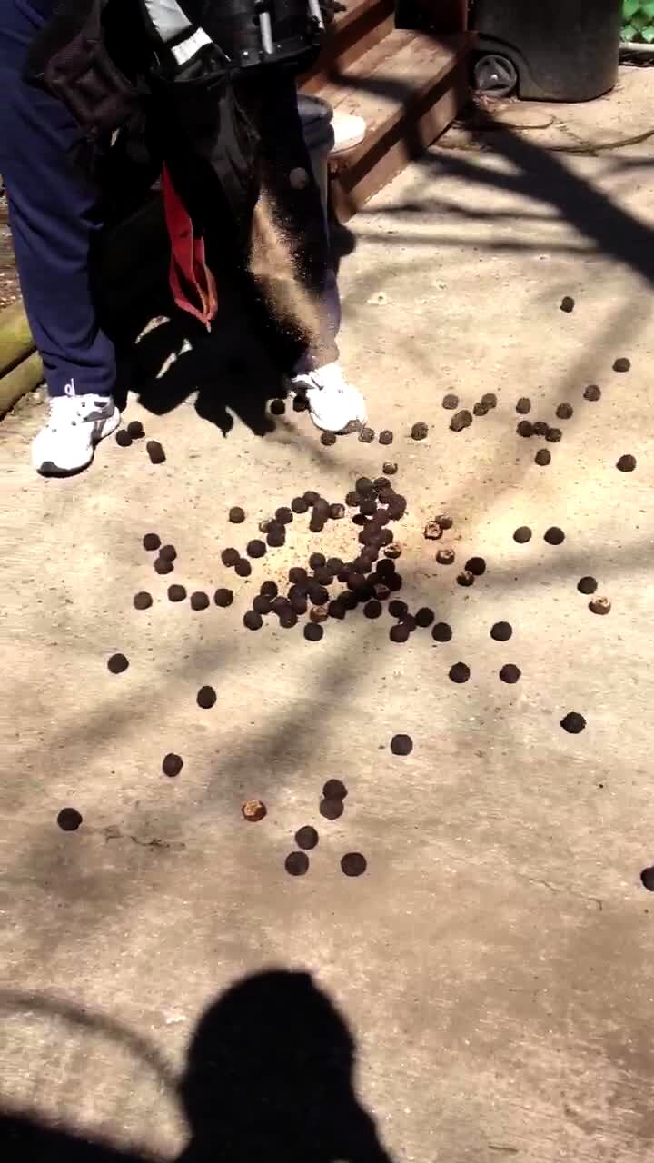 A man explains to the camera that he thinks an animal may be living in his shed because he's just taken his golf bag out for the first time this year. The man dumps the golf bag upside down and a lot of nuts pour out.