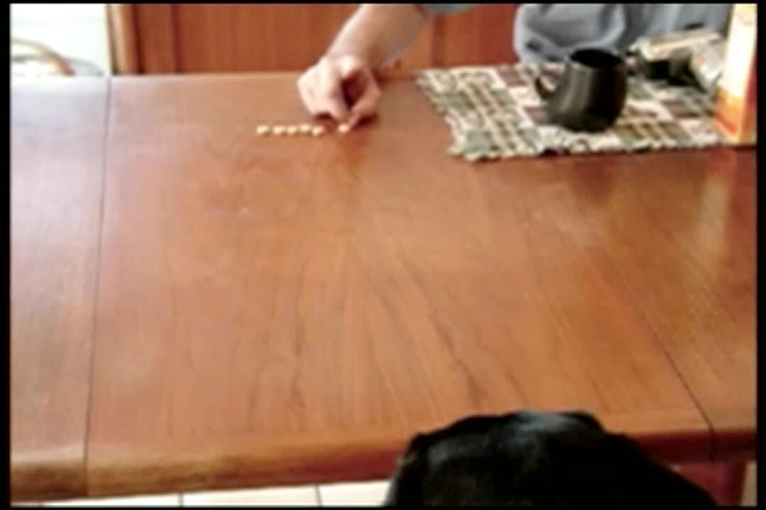A.A. Pet Tricks. Man flicks cereal off the table toward a dog. The dog catches every piece. From several different angles.