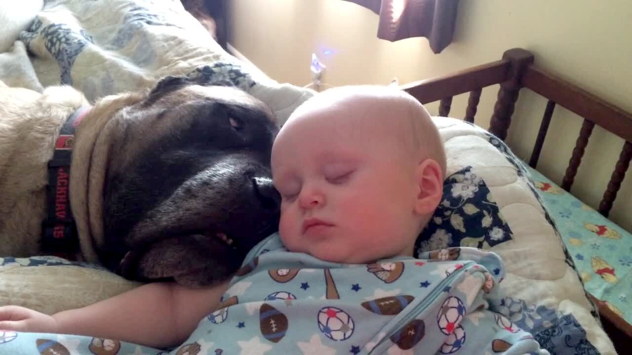 A baby boy sleeps next to a snoring Mastiff dog indoors.