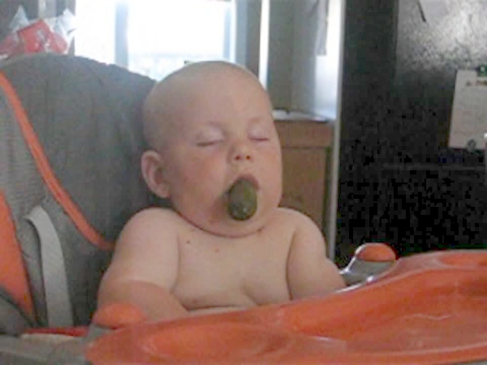 A baby boy sleeps with his face in his food and, when he lifts his head, there is ketchup in the middle of his forehead.