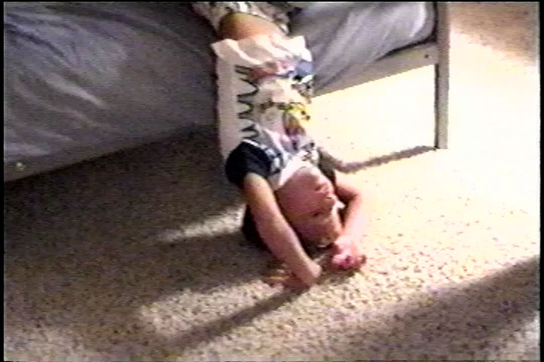 Boy is sleeping upside down with only half of his body on the bed. Sleeps in a funny position. Good visual. Dad wakes him up.