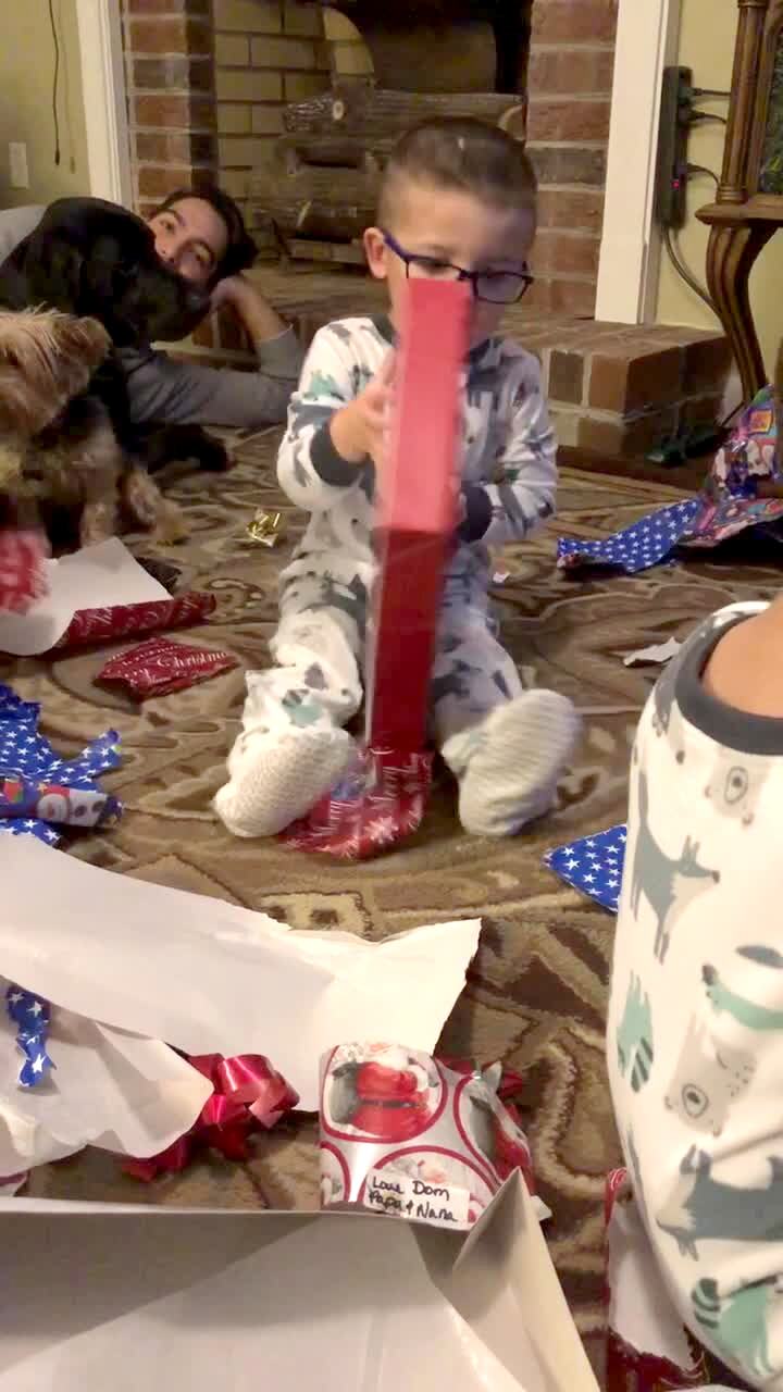 A tot boy unwraps his Christmas present. When he sees tissue paper he screams in excitement that he "got paper towels!"