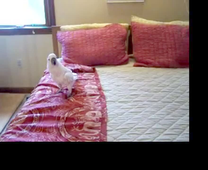 Cockatoo bird jumps around on a bed like it's a trampoline.