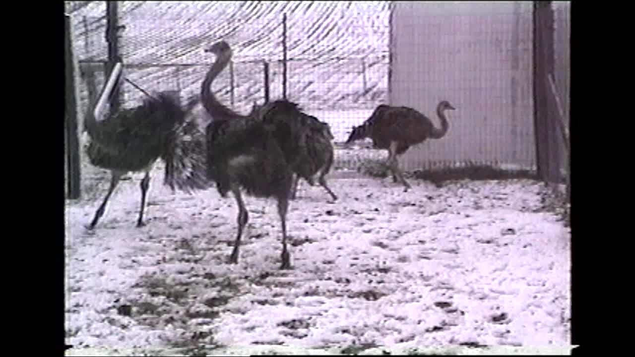 Two men stand in the middle of a group of ostrich birds. 1 man gets pecked in the ankle by an ostrich. Man kicks his leg up at ostrich. Emu. Bird.