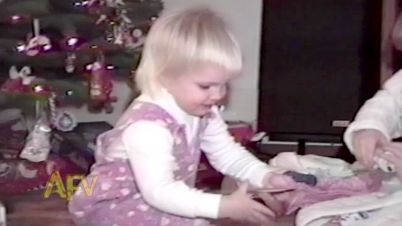Tot girl gets X-mas gift, looks annoyed, and then says, "I didn't ask for socks!" Christmas