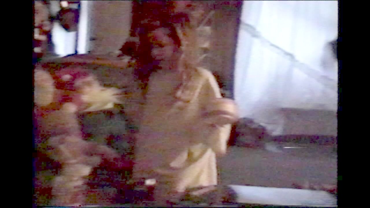 Tot girl gets Christmas present. Its a baby doll that cries. She tries to lay it in the crib so it stops crying. She gets upset and kicks the crib when the baby doesn't stop crying.