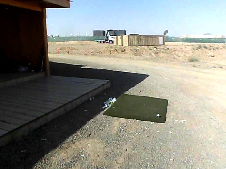 A military man swings at a golf ball on a base and breaks the head of his golf club.