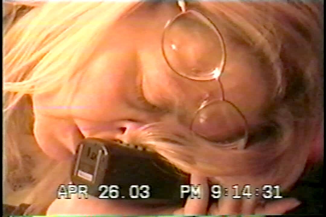 A woman crouches under an automatic hand dryer in a public bathroom at :10, her cheeks flap from the air, and her false teeth/ denture fly out.