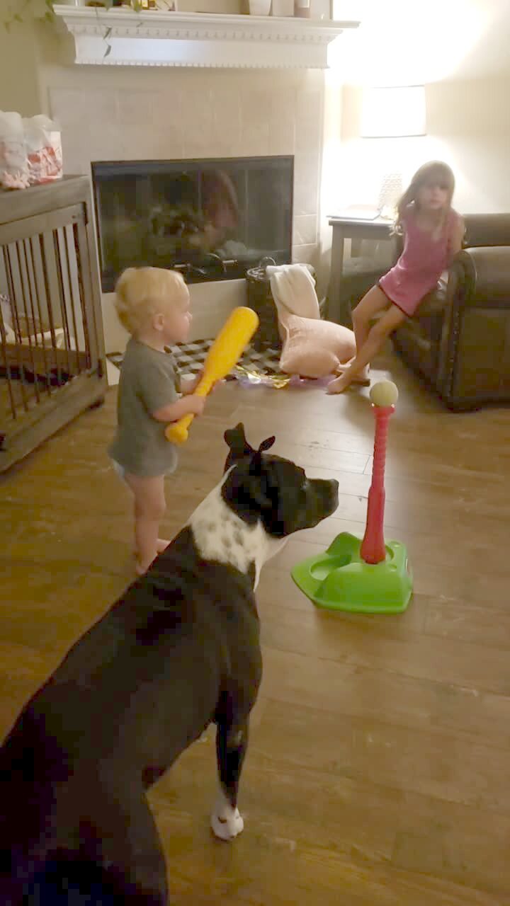 A dog takes a ball off of a tee before a tot boy hits it in a living room.