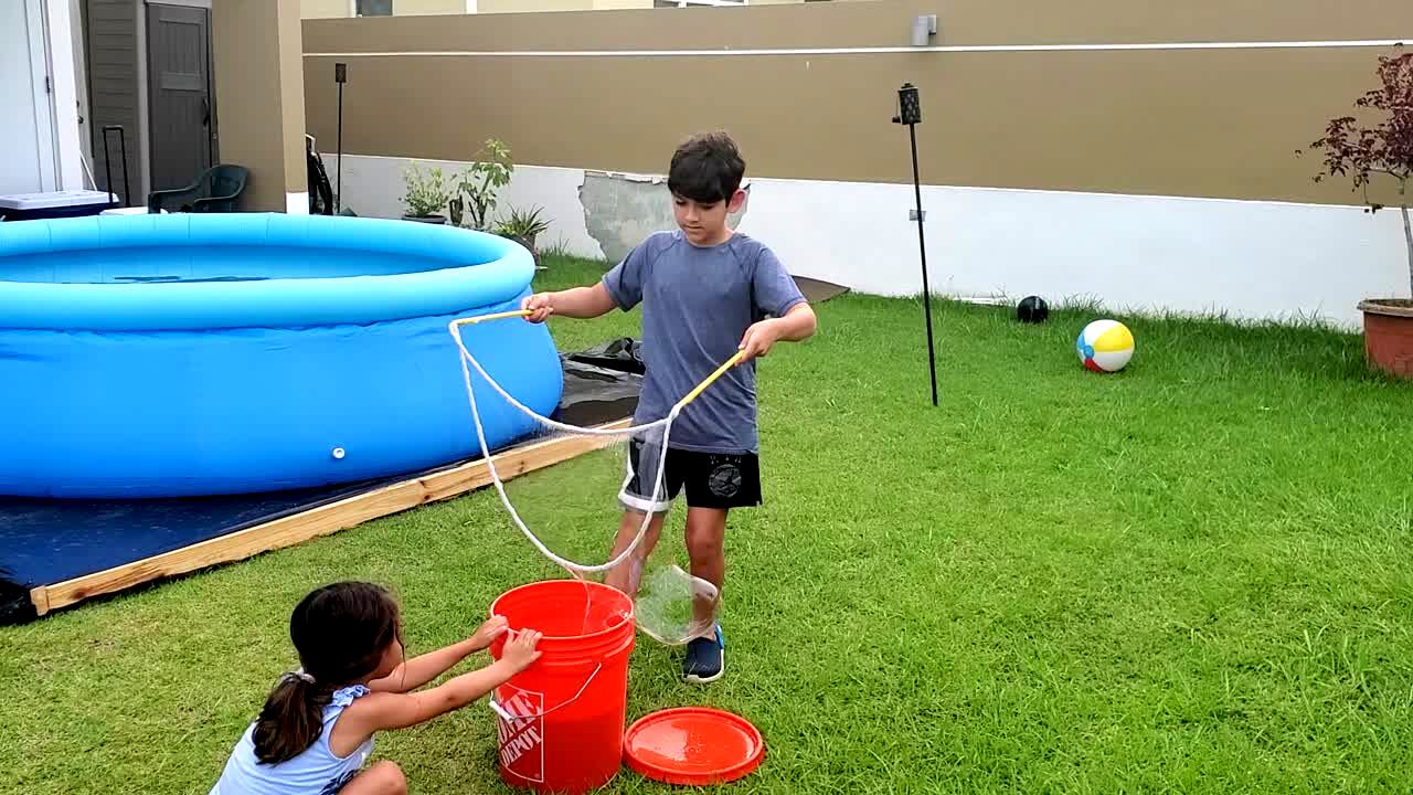 A man in a swimming pool in a yard throws a ball to a Boston Terrier dog outside the pool and the dog jumps up and knocks the ball into a toy basketball hoop.