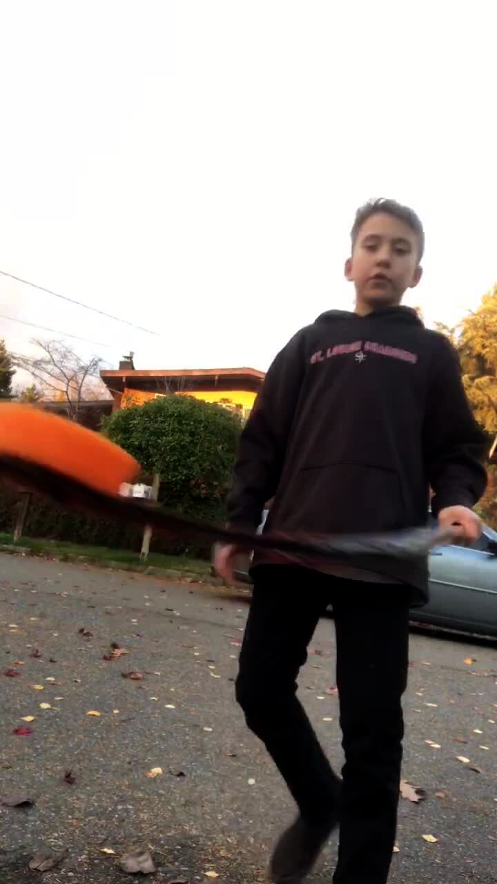 A young boy holds a hockey puck on the end of a hockey stick as he shows it to the camera in the street. He launches the puck into the air, spins himself and the stick around, then catches the puck on the end of the stick.