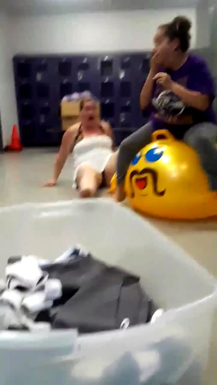 A woman sits on an inflatable ball and a woman bounces on an inflatable ball next to her in a locker room. She bounces and pops the ball and falls to the floor.