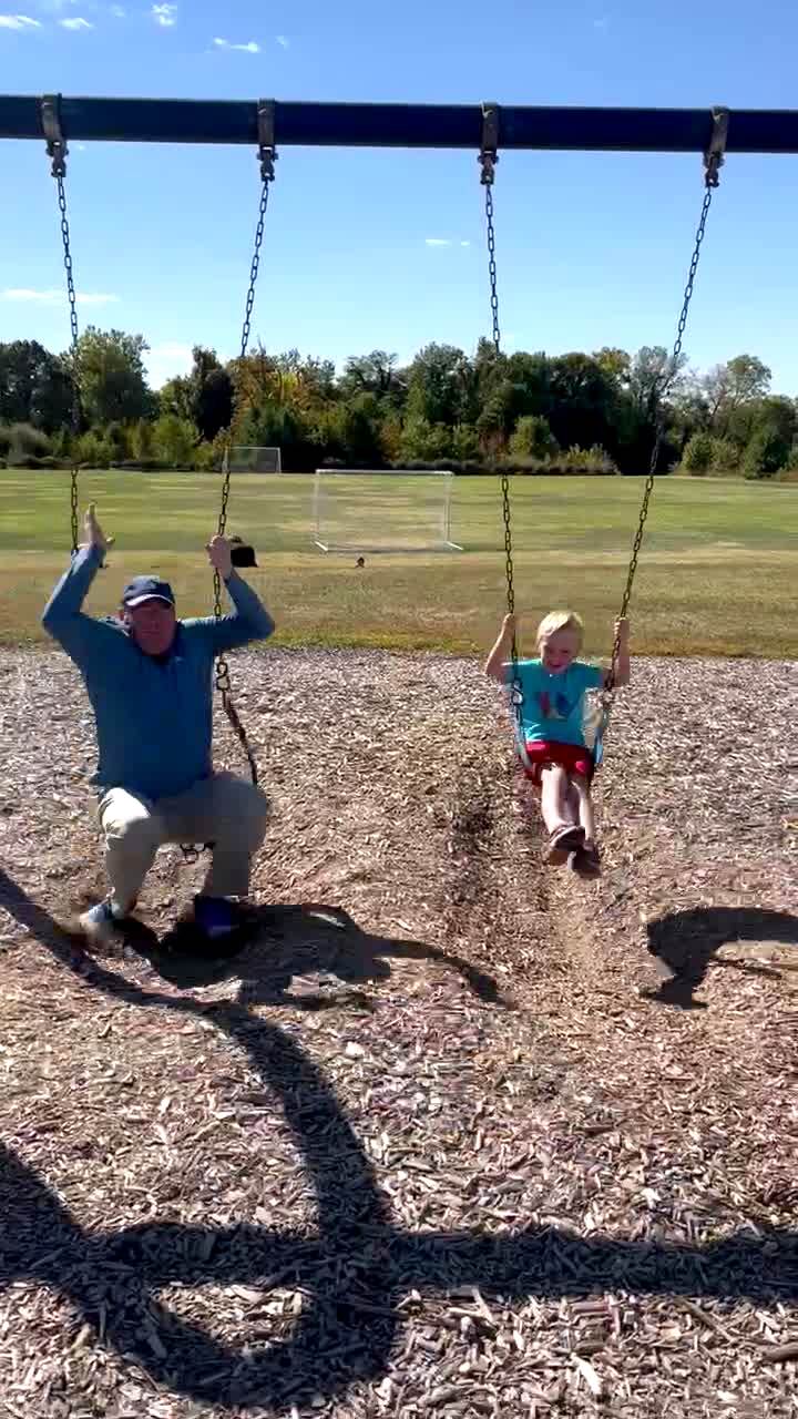 A man and a young boy swing on a swing set at a playground. The mans swing breaks on his way back down and he falls on his butt.