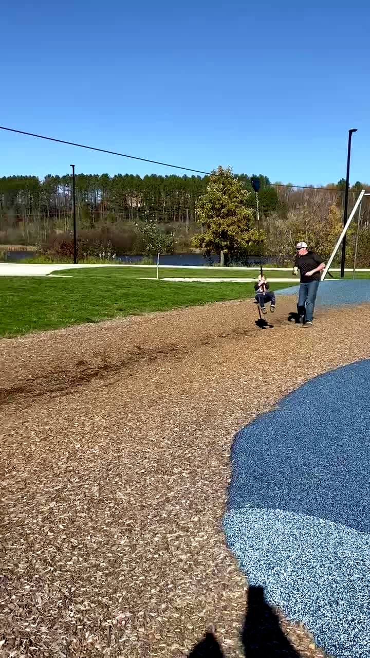 A girl slides down a zip line slide and chases a boy running in front of the zipline. She bumps into him and knocks him down to the ground. The camera woman, a senior man, and another boy laugh.