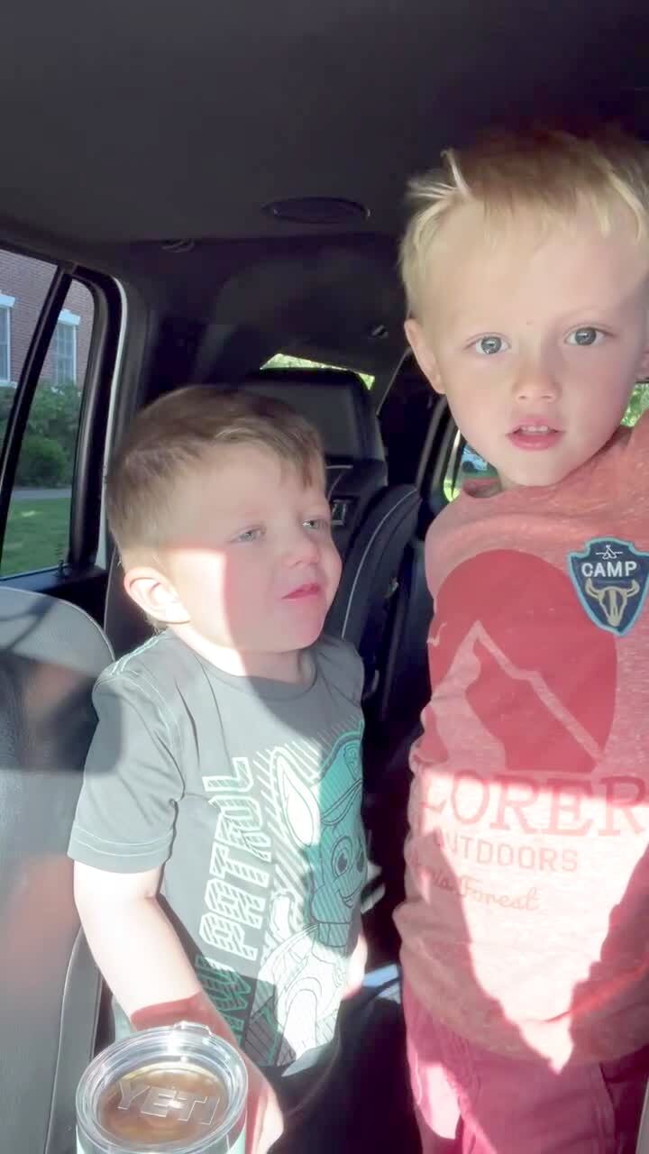 A tot boy in a car says, "Happy Anniversary, we don't love you." Another boy looks at him and asks, "We don't?"