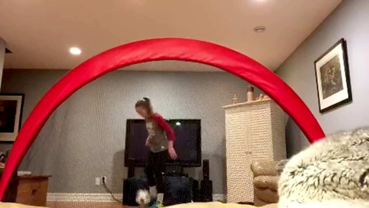 A young girl practices soccer tricks in the house and kicks the ball and breaks something with glass.