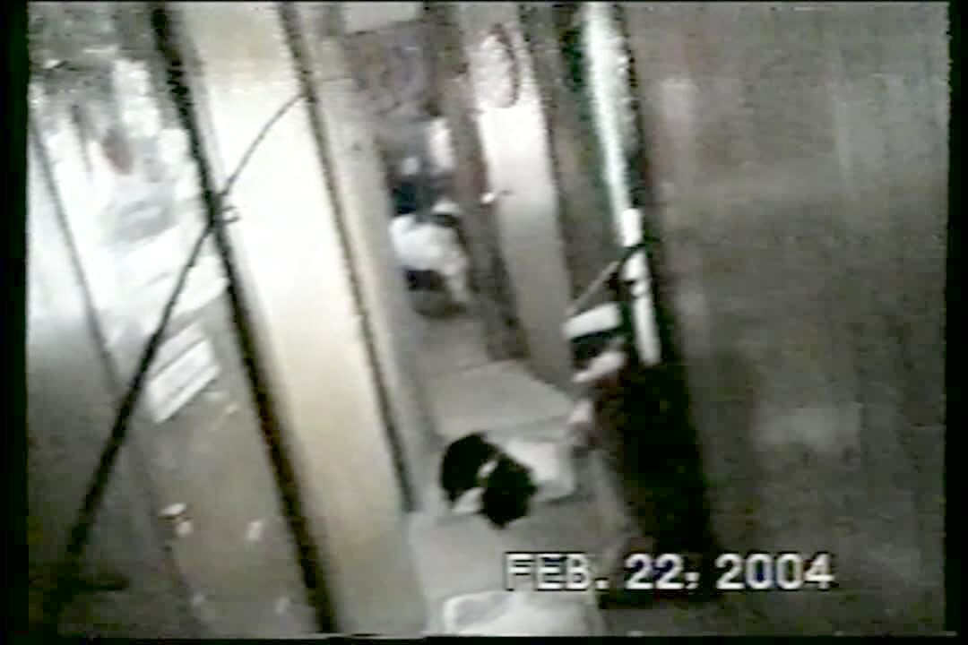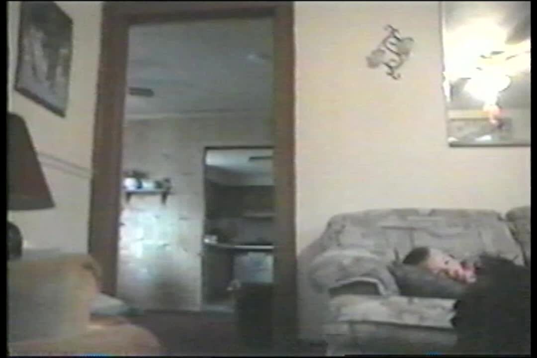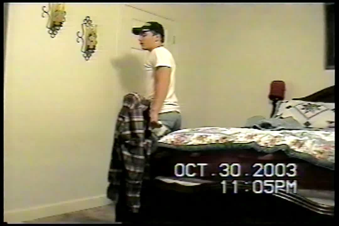 Man in mask hides in closet, scares man when he opens the door. Man who is scared falls backwards over bed. Practical joke, hidden camera, Halloween. Date on screen 2003.
