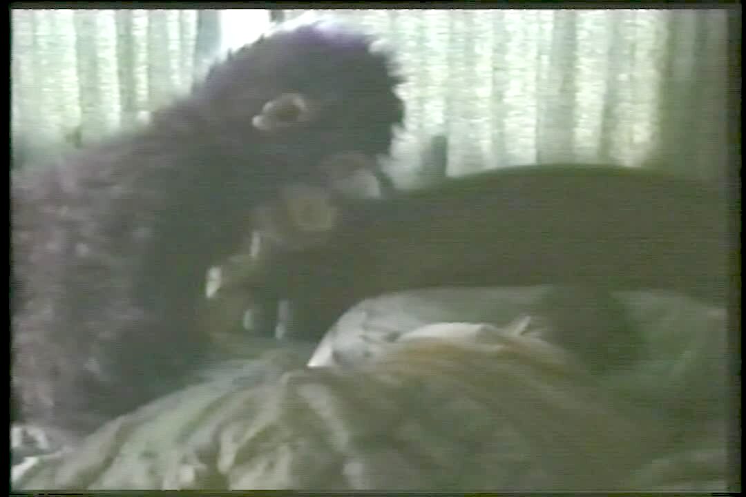 A man is scared by a person in a gorilla suit hiding in a shadow.