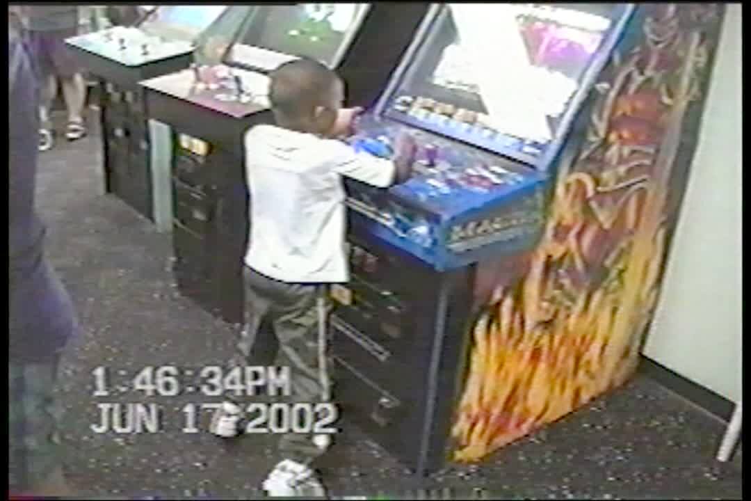 Kids playing dance video game. Camera pans across 2 boys doing it and then a baby in a jolly jumper. Siblings. Brothers.