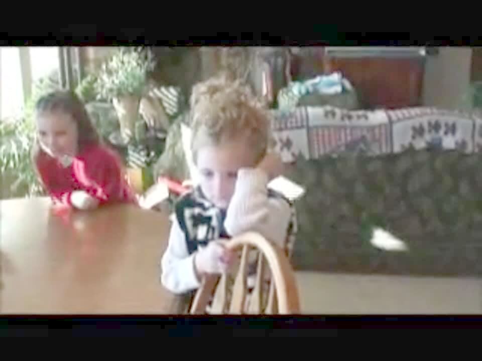 A young girl in the dining room counts to twenty in Spanish. Her younger sister sitting next to her smears pudding on her forehead.