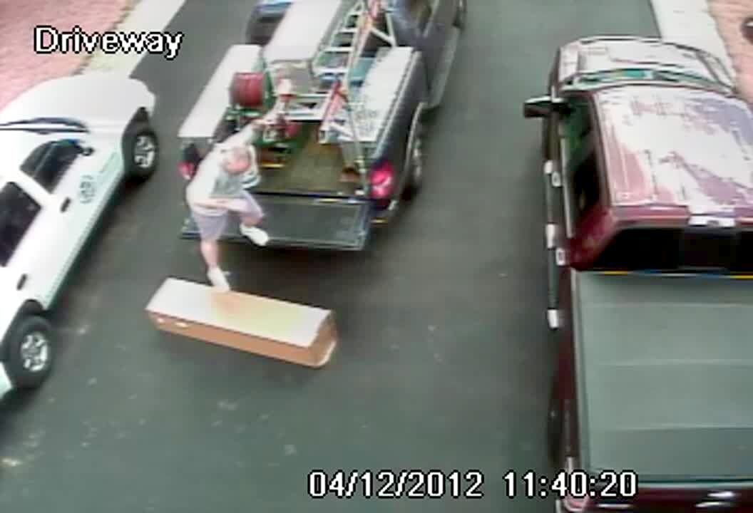 A man tries to slam a pickup truck's tailgate shut on a driveway, but it reopens and hits him in the groin. Security footage. Person across the street not talent released.