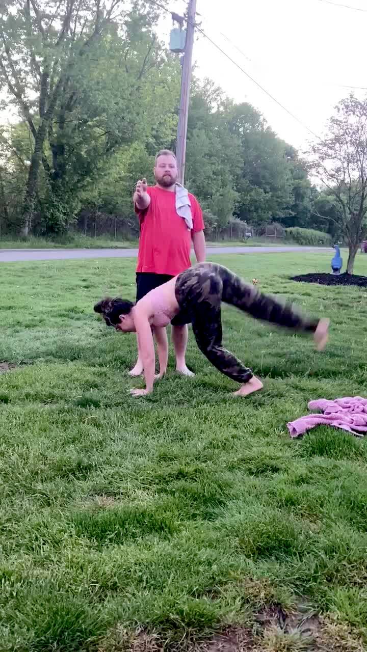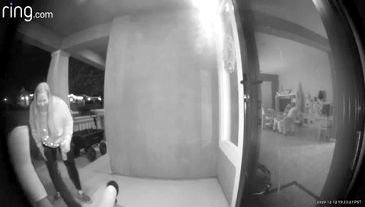A woman screams and runs around her friend's yard while a skunk chases her. Home security footage.