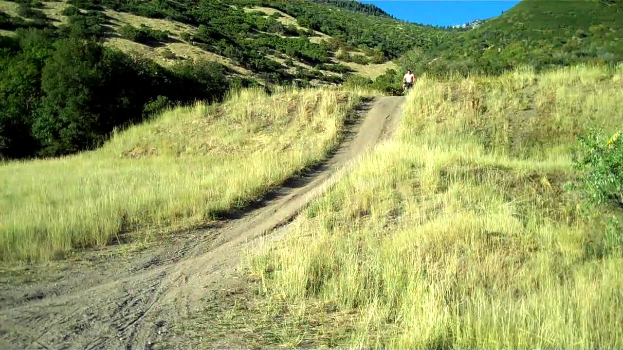 Teen boy rides bike off ramp on dirt trail/road into pond, flies off bike and screams.