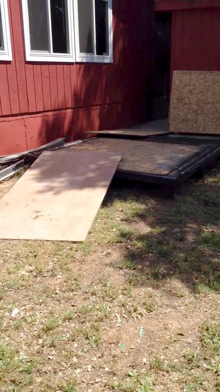 Boy rides his bike on cement foundation with a big hole in the middle. Boy rides up to the hole & falls in.