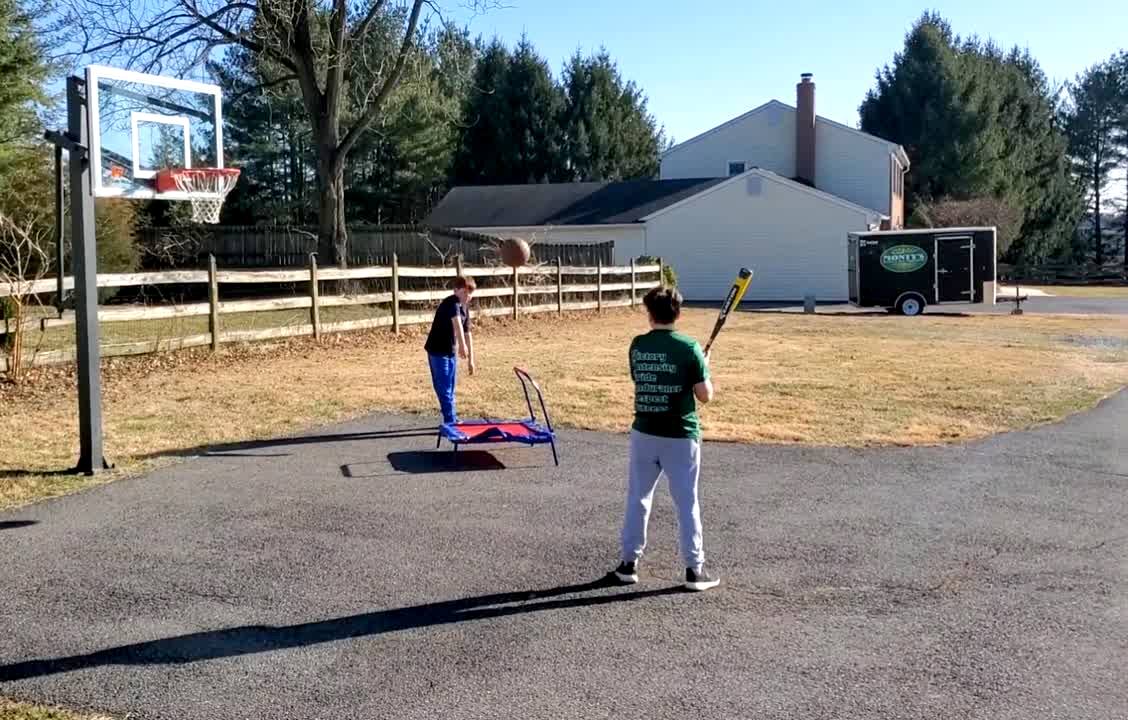 A group of teen boys do a basketball trick shot where one boy throws it across the yard to other boys at a pool who catch it and pass it to each other and the last boy shoots it into the hoop in slow motion.