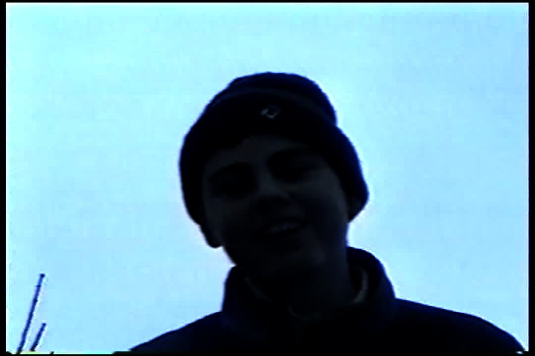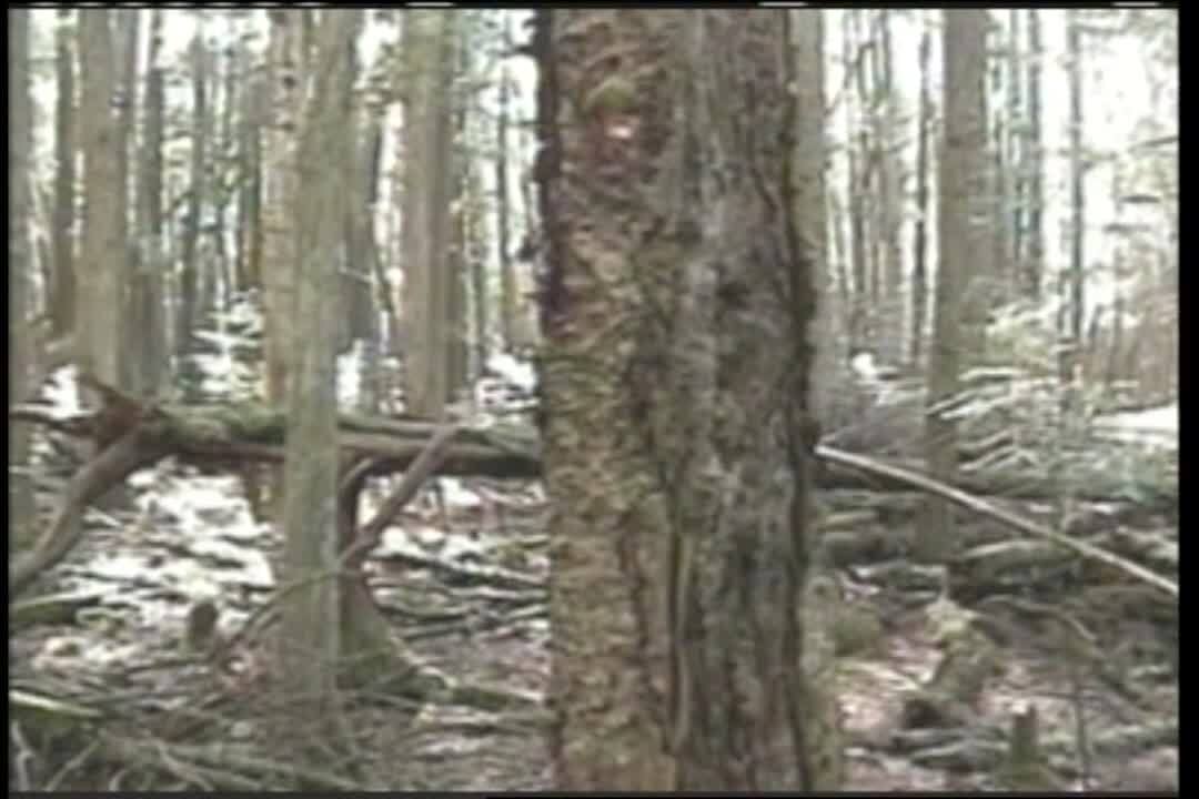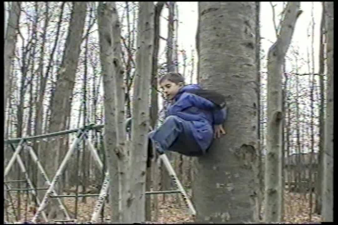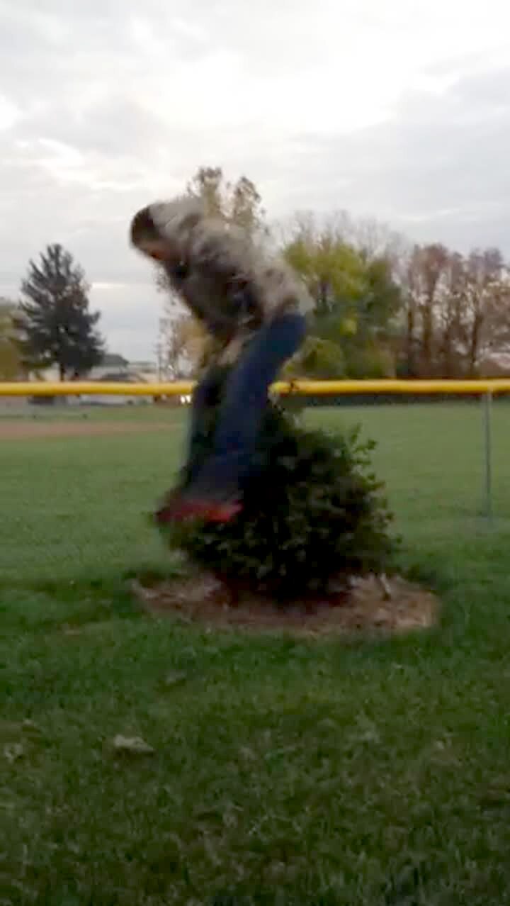 Young man runs into tree three times before finally breaking through it & falling down. Woods. Bonehead.