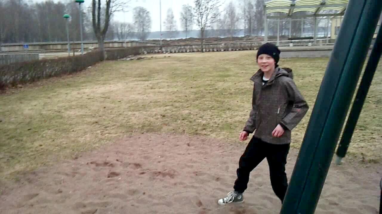A boy runs back and forth to shut large gates outdoors. Each time he closes one and runs to get the other, the wind blows the first gate open again. After he trips and falls he eventually closes the gates.