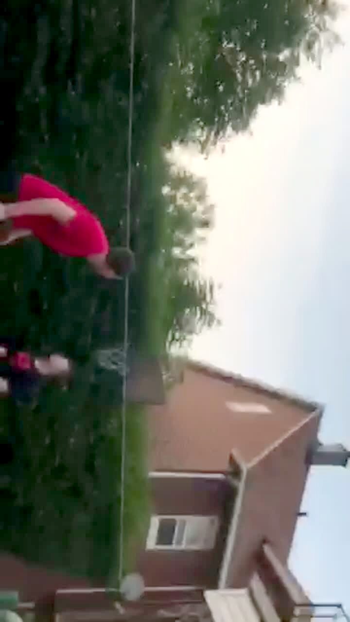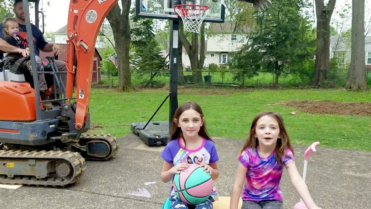 A girl throws a basketball over her shoulder in the yard and her dad uses the bucket of an excavator to catch the ball and then drops it in a hoop.