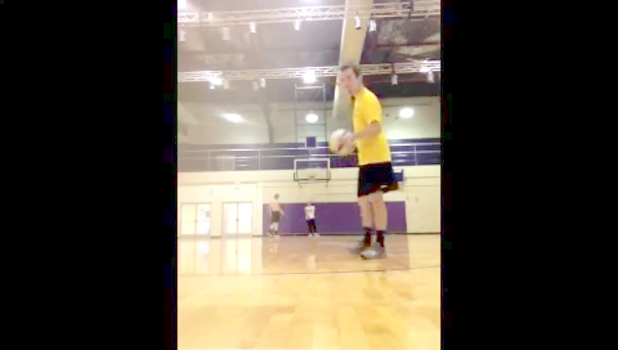 A man screams in a gymnasium when a teen girl kicks a soccer ball over her head and it goes in to a basketball hoop.