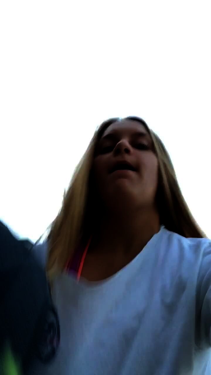 A teen girl tries to do a basketball trick shot but the basketball bounces back and hits her in the head.